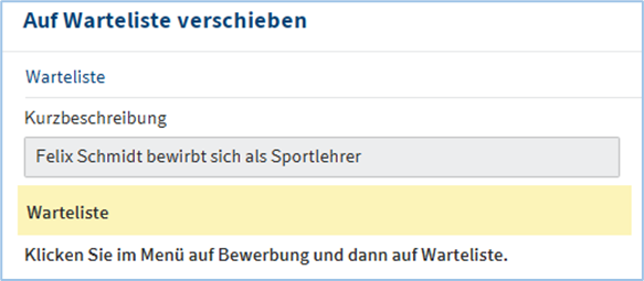Wenn Sie es wollen, können Sie dieses Bewerberauswahl Prozess für Bewerber*innen auf Warteliste nochmal im Menü: „Bewerbung“ nochmal starten, indem Sie Schaltfläche Bewerberauswahl klicken.
