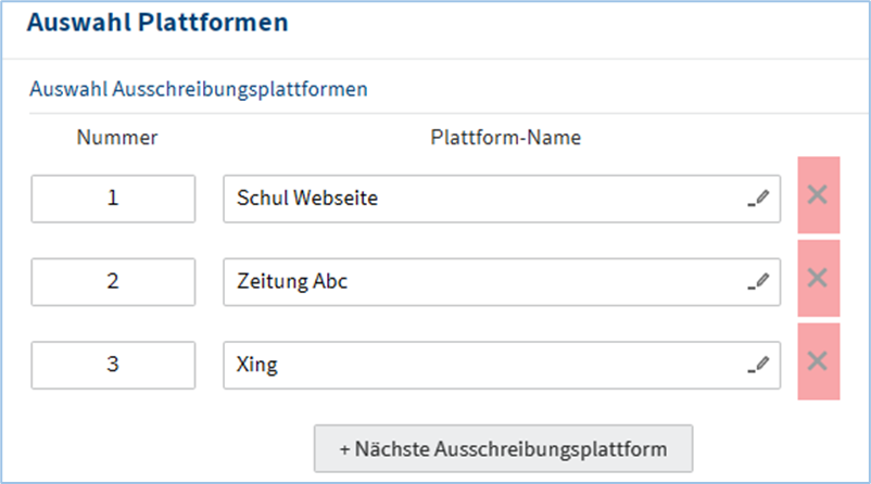 In der Folgenden Aufgabe "Auswahl Plattformen" können Sie Ausschreibungsplattformen angeben auf denen die Ausschreibung veröffentlicht werden soll. Sie können den Namen entweder eintippen oder auf aus der Liste (Tastenkürzel F7) eine Plattform auswählen.