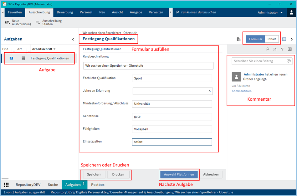 Wenn der Workflow beendet ist, haben Sie eine neue Ausschreibung erstellt und im Ordner Bewerber-Management/Ausschreibungen eine Übersicht über die erstellte Ausschreibung.