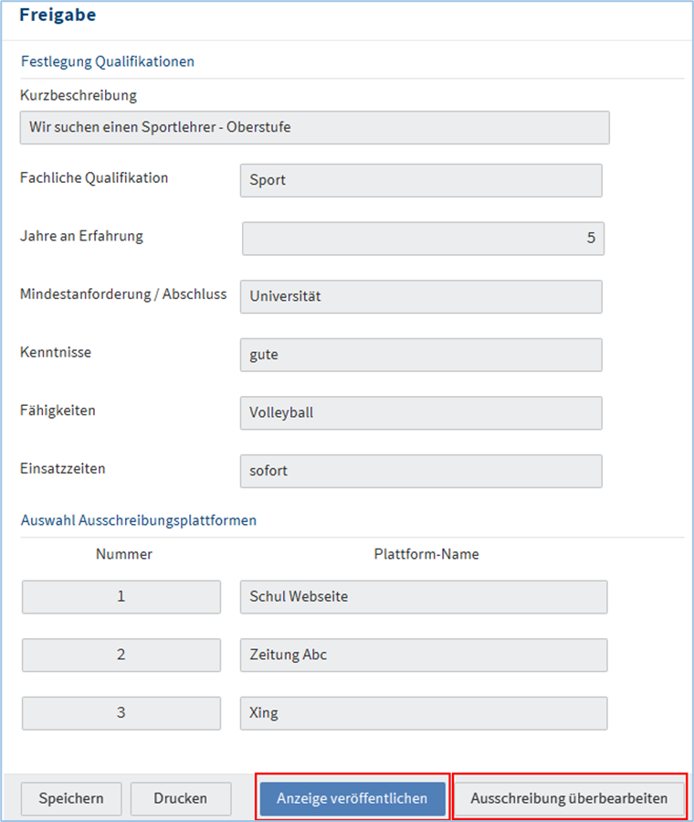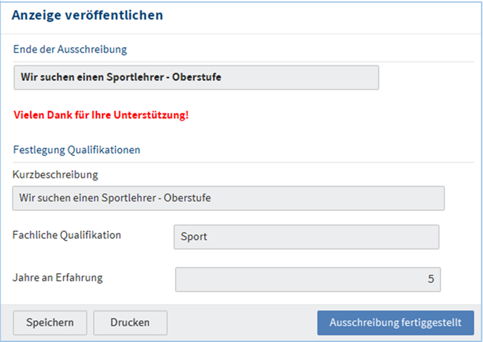 Nun ist es an der Zeit die Anzeigen der Ausschreibung zu veröffentlichen. Nachdem das erfolgreich beendet wurde können Sie auf Ausschreibung fertiggestellt klicken um den Workflow abzuschließen.