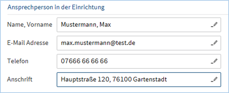 Geben Sie bitte die Kontaktdaten der Ansprechperson in der Einrichtung ein.