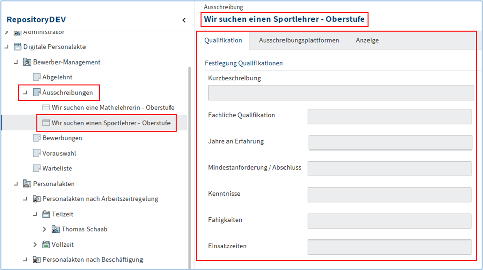 Digitale Personalakte --> Bewerber-Management --> Ausschreibungen --> Wir suchen einen Sportlehrer - Oberstufe