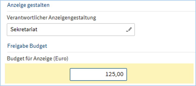 Wählen Sie die Verantwortliche Person zur Anzeigengestaltung aus und geben Sie das Budget für die Anzeige an.