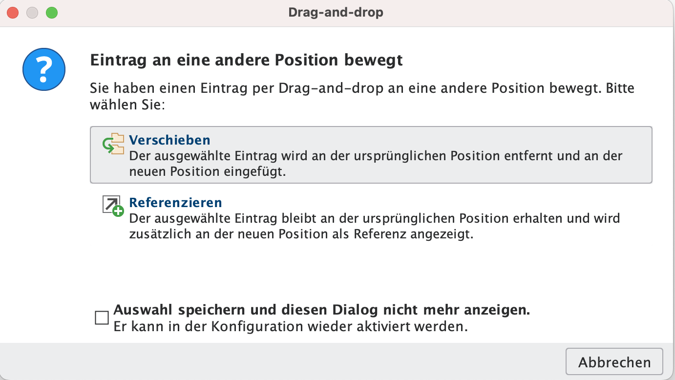 Wird dieser Dialog deaktiviert, werden die Objekte standardmäßig immer verschoben und es erfolgt keine Abfrage nach einer Referenz.