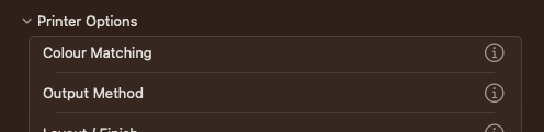 Select the newly added Printer Bizhub C250i and scroll all the way down to Printer Options. Click on the litte i on the right side beside Output Method.