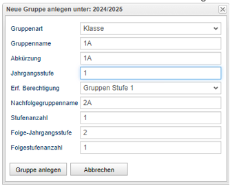 Das Gruppenfenster schließt sich. Laden Sie einmal den Cache neu und öffnen Sie die Gruppenverwaltung. Nun sind alle Schüler*innen ins neue Schuljahr angehoben worden und das Folgejahr wurde angelegt.